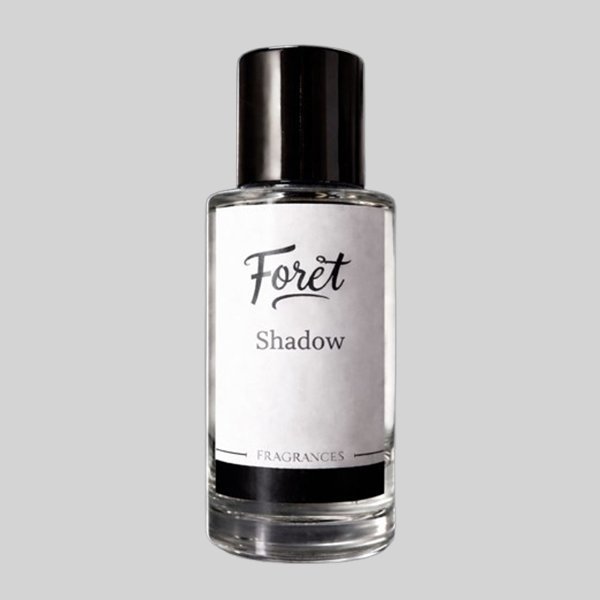 Forêt Shadow perfume bottle on dark background, luxury fragrance, minimalist black and white label, premium scent for men and women.